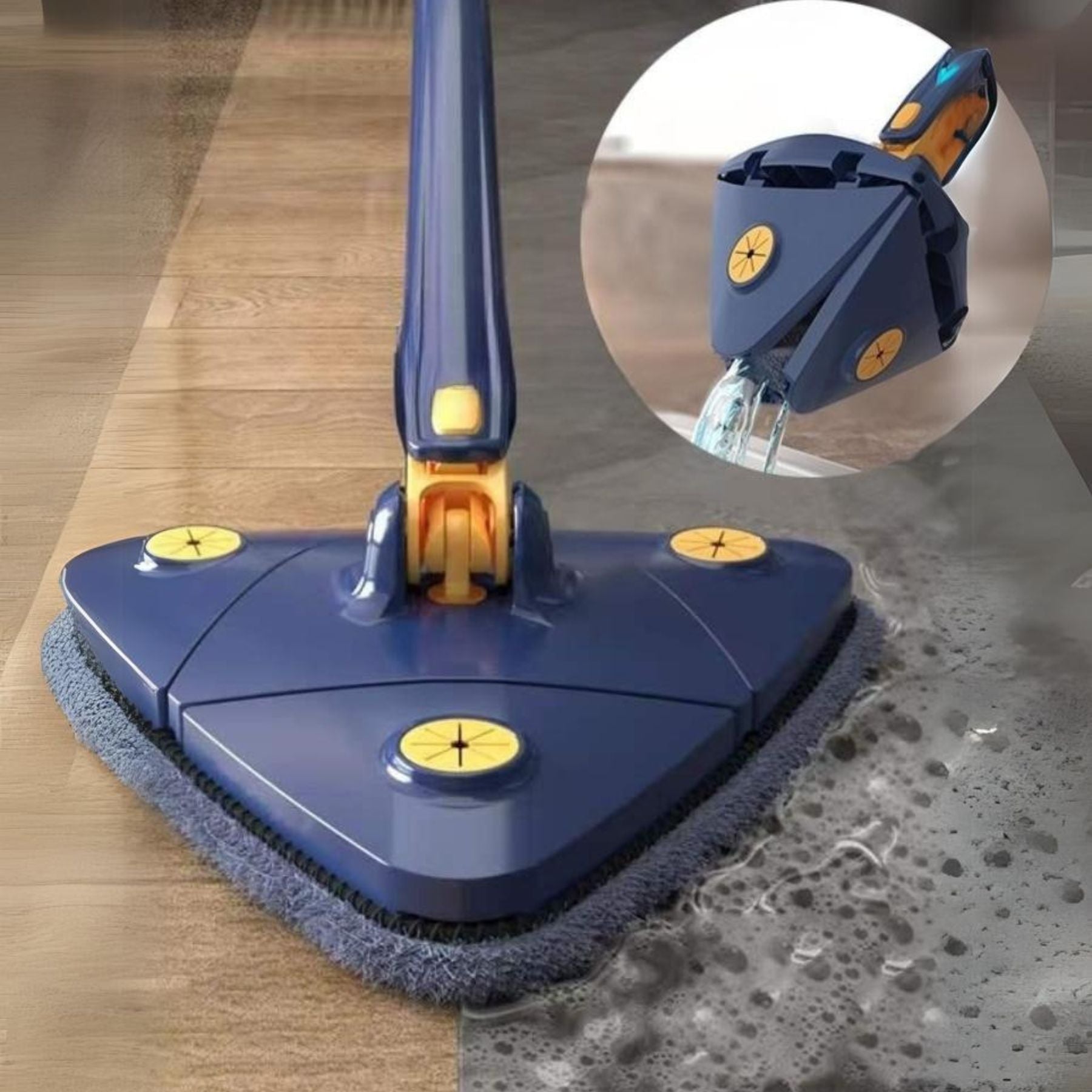 Deja Reluciente Cualquier Entorno de tu Casa con Esta Mopa Triangular La mopa giratoria multifuncional de 360 grados llega hasta donde los productos convencionales no llegan. No gastes más tu dinero innecesariamente, ahorra tiempo y dinero con esta mopa innovadora.